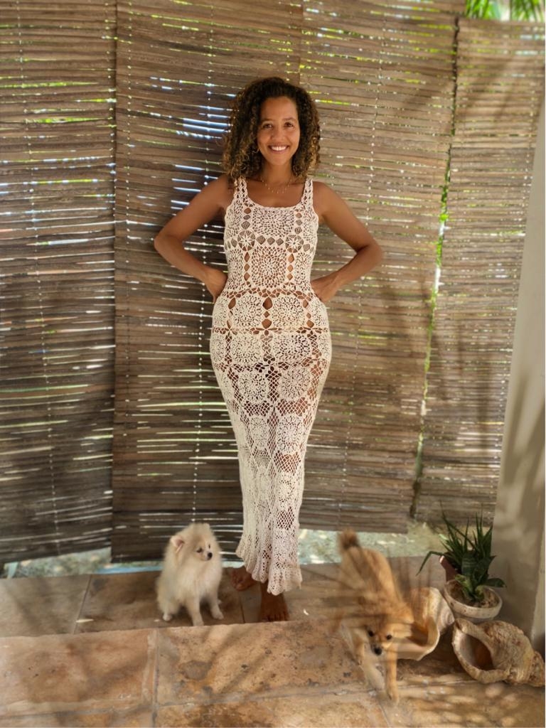 Dress made in Crochet, with 100% cotton yarn, long with mandalas application, we make it to order, on your mannequin